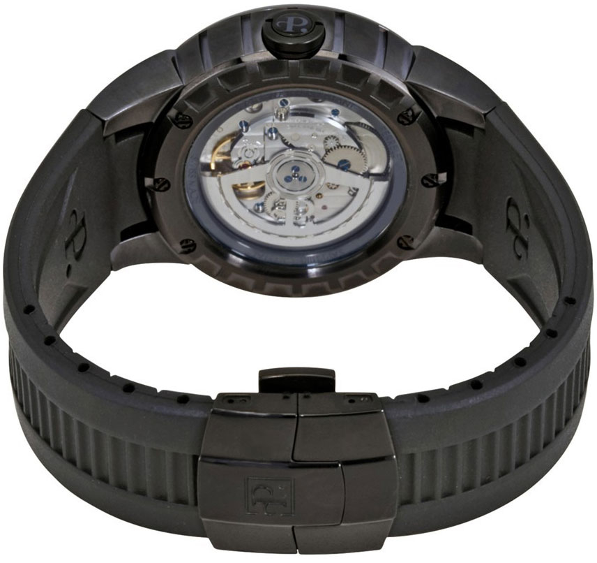 Ремешок Turbine A1047/A черного цвета выполнен из натурального каучука c тиснением в виде логотипа бренда, браслетная застежка “бабочка” из нержавеющей стали с чернением, раскладывающаяся при нажатии кнопок двойной блокировки.