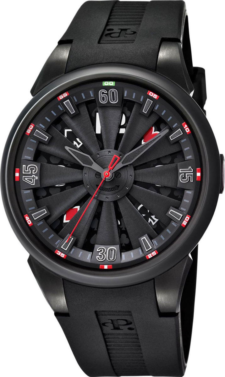 Циферблат с видимым ротором автоподзавода Double Rotor, стилизованным под лопатки турбины реактивного самолета, которые имеют чернение. Поверхность циферблата под вращающимся в двух направлениях ротором с цифрами и мотивом в виде карточных мастей. Рисованные цифры контрастного белого цвета, стрелки с покрытием золотом.
