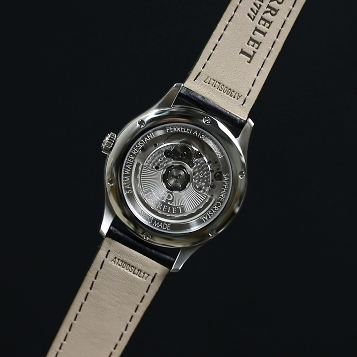 Круглый корпус Perrelet A1300/1 выполнен из высокосортной нерж. стали с зеркальной полировкой поверхности. Диаметр корпуса составляет 39 мм, толщина – 9,56 мм. Задняя крышка с прозрачным окном соединяется с корпусом 6 винтами. Водостойкость 5 АТМ.