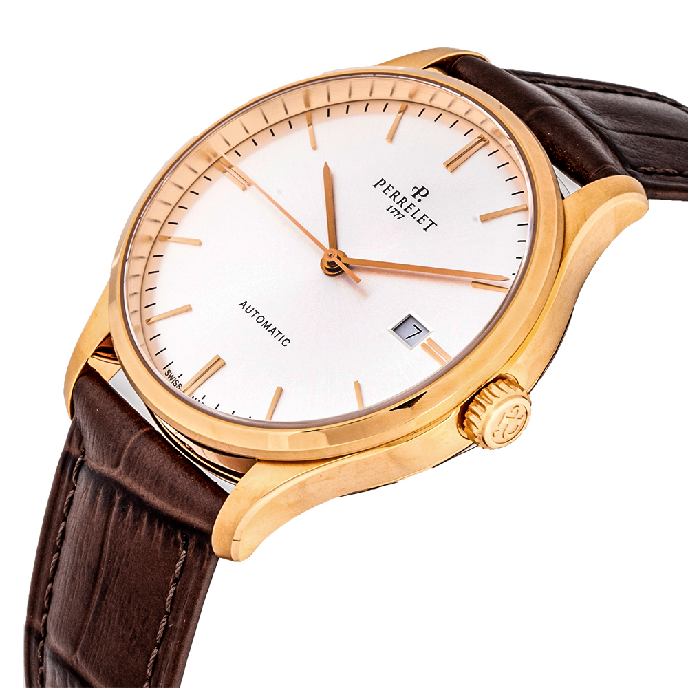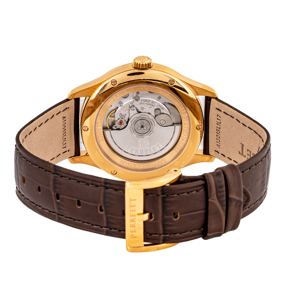 Круглый корпус Perrelet A1301/1 выполнен из высокосортной нерж. стали с PVD покрытием цвета розового золота и зеркальной полировкой поверхности. Диаметр корпуса составляет 39 мм, толщина - 9,56 мм. Задняя крышка с прозрачным окном соединяется с корпусом 6 винтами. Водостойкость 5 АТМ.