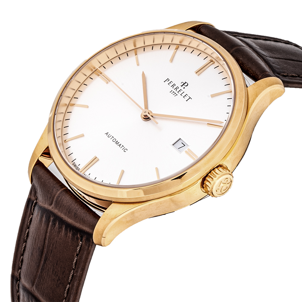 Круглый корпус Perrelet A1301/3 выполнен из высокосортной нерж. стали с PVD покрытием цвета розового золота и зеркальной полировкой поверхности. Диаметр корпуса составляет 39 мм, толщина - 9,56 мм. Задняя крышка с прозрачным окном соединяется с корпусом 6 винтами. Водостойкость 5 АТМ.