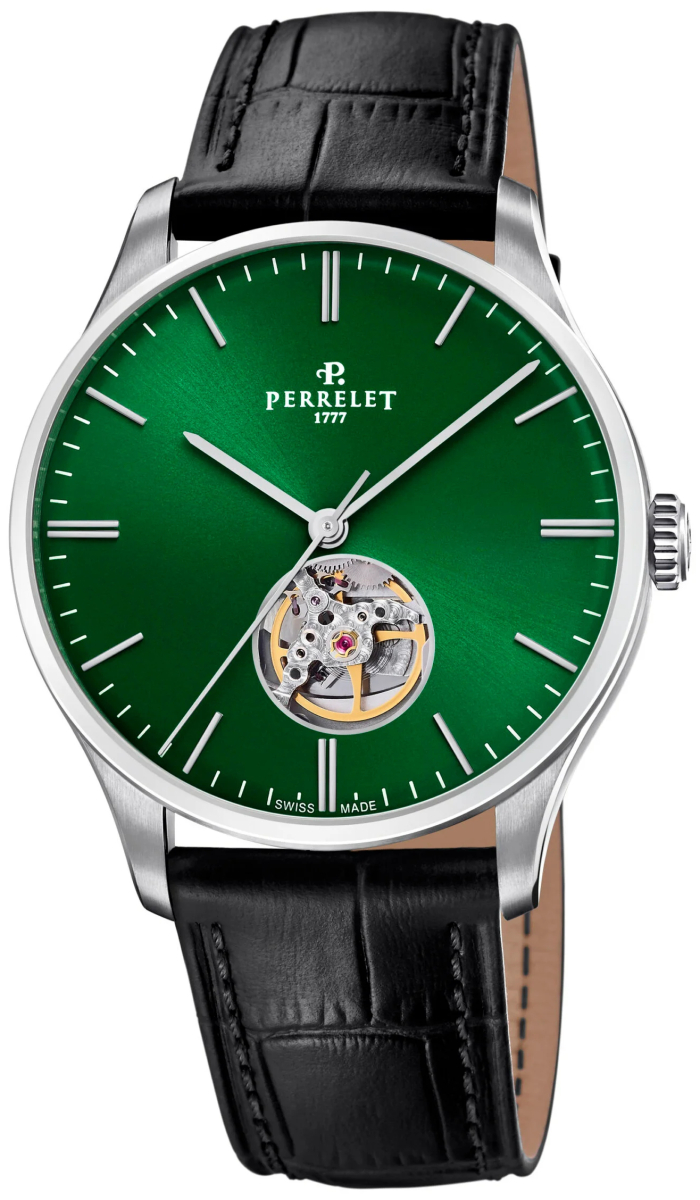 Швейцарский механизм с автоматическим подзаводом In-house калибр Perrelet P-391. Запас хода составляет около 42 часа, частота колебаний баланса 28.800 v.p.h или 4 Гц, 93 компонента и 25 рубинов в качестве камневых опор и палет анкерной вилки. Мосты и платина имеют покрытие родием и украшены финишной шлифовкой Circular grained и Cotes de Geneve, полый ротор автоподзавода декорирован в стиле “Perrelet”, шляпки винтов отполированы и декорированы синением. Функции: часовая, минутная и секундная стрелки. Частично скелетонизированный механизм открывающий со стороны циферблата работу регулятора хода и колебания балансового колеса.