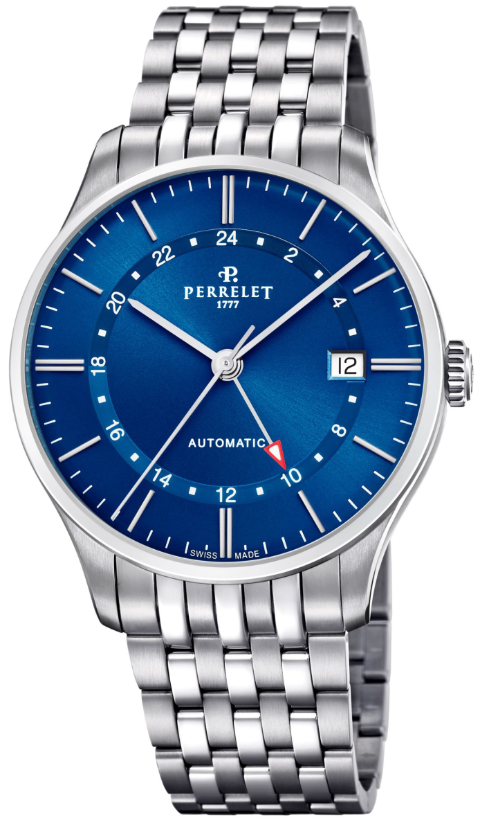Швейцарский механизм с автоматическим подзаводом, In-house калибр Perrelet P-401. Запас хода составляет около 42 часа, частота колебаний баланса 28.800 v.p.h или 4 Гц, 93 компонента и 25 рубинов в качестве камневых опор и палет анкерной вилки. Мосты и платина имеют покрытие родием и украшены финишной шлифовкой Circular grained и Cotes de Geneve, полый ротор автоподзавода декорирован в стиле “Perrelet”, шляпки винтов отполированы и декорированы синением. Функции: часовая, минутная и секундная стрелки, индикация даты и время во втором часовом поясе при помощи доп. центральной стрелки.