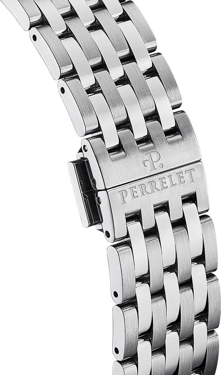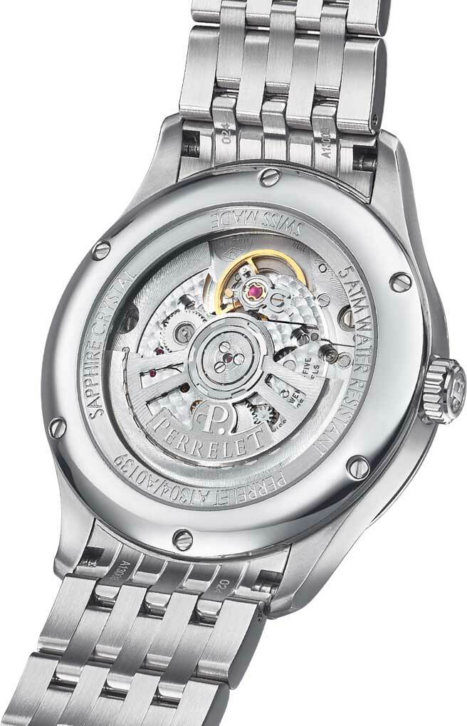 Круглый корпус Perrelet A1304/9 выполнен из высокосортной нерж. стали с зеркальной полировкой поверхности. Диаметр корпуса составляет 39 мм, толщина - 9,56 мм. Задняя крышка с прозрачным окном соединяется с корпусом 6 винтами. Водостойкость 5 АТМ.