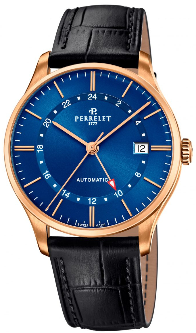 Швейцарский механизм с автоматическим подзаводом, In-house калибр Perrelet P-401. Запас хода составляет около 42 часа, частота колебаний баланса 28.800 v.p.h или 4 Гц, 93 компонента и 25 рубинов в качестве камневых опор и палет анкерной вилки. Мосты и платина имеют покрытие родием и украшены финишной шлифовкой Circular grained и Cotes de Geneve, полый ротор автоподзавода декорирован в стиле “Perrelet”, шляпки винтов отполированы и декорированы синением. Функции: часовая, минутная и секундная стрелки, индикация даты и время во втором часовом поясе при помощи доп. центральной стрелки.