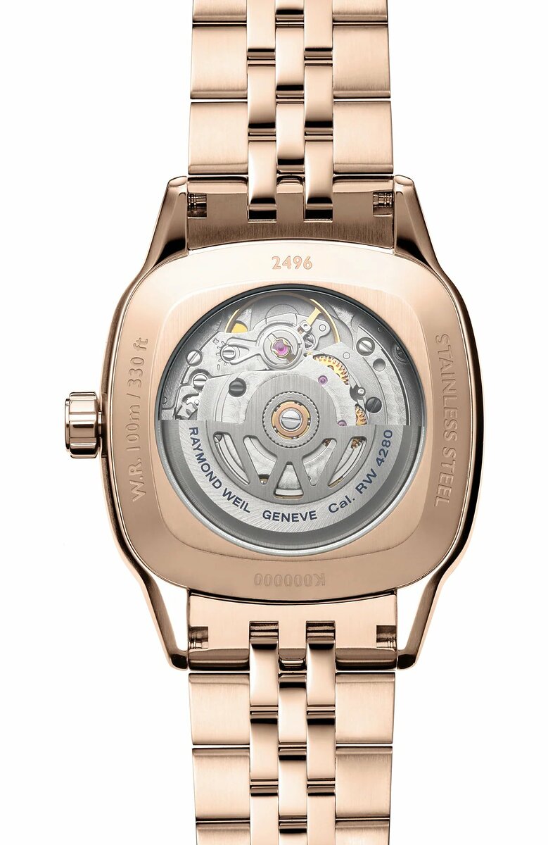 Модель Raymond Weil Freelancer 2496-P5S-40051идет на браслете из нерж. стали с литыми звеньями в 5 рядов, PVD покрытие цвета розового золота. Браслетная застежка, раскладывающаяся при нажатии на кнопки с двойной системой блокировки, украшена логотипом Raymond Weil.
