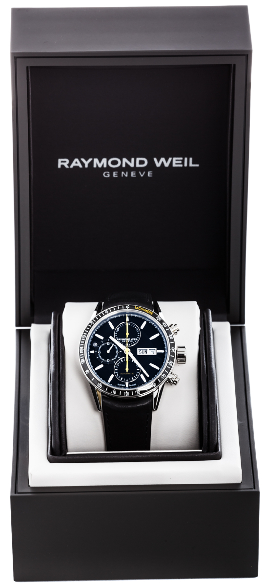 Модель Raymond Weil Freelancer 7731-SC1-20121 идет на черном ремешке из высококачественной телячьей кожи. Браслетная застежка, раскладывающаяся при нажатии на кнопки с двойной системой блокировки, украшена логотипом Raymond Weil.