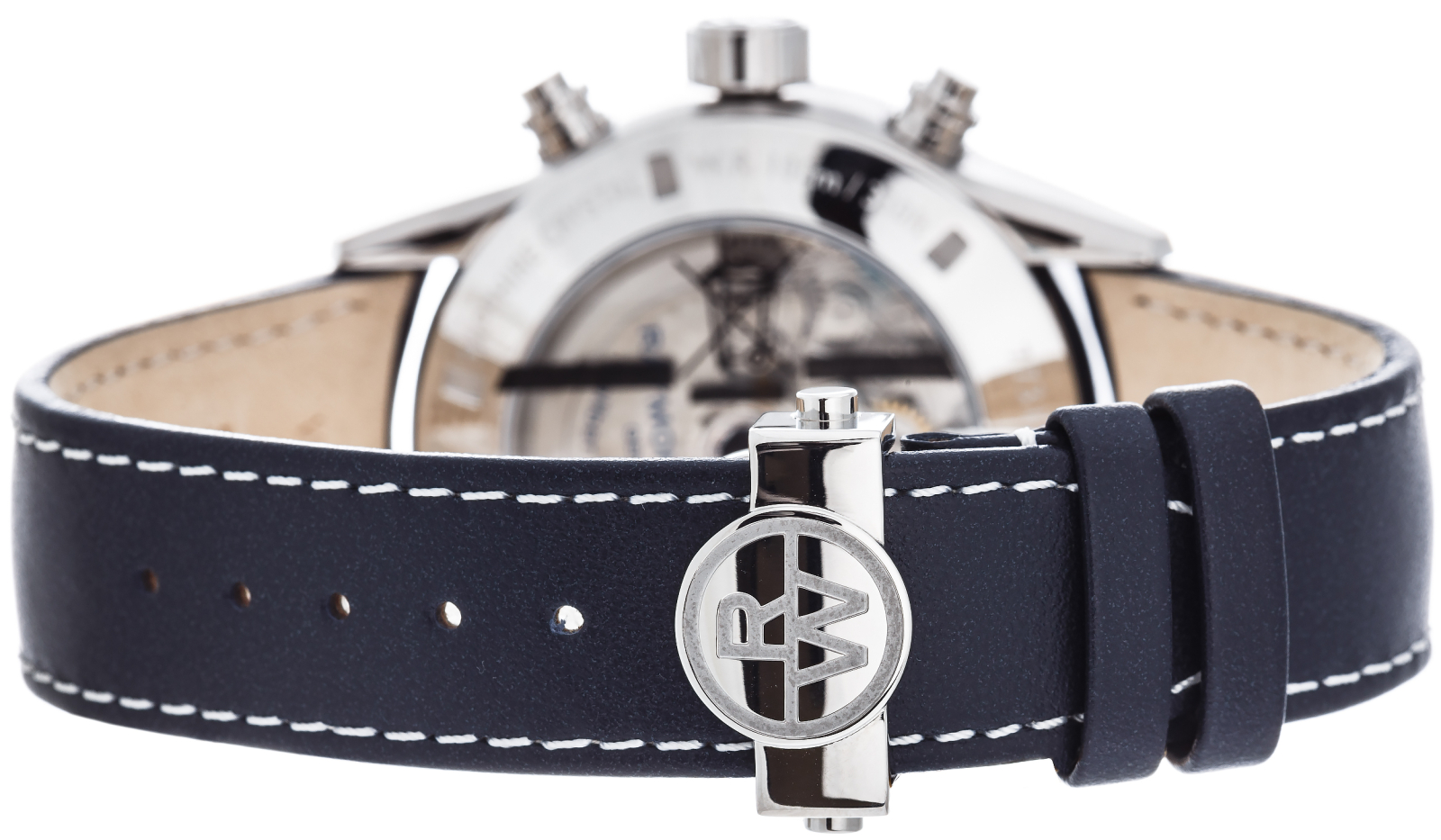 Корпус круглой формы выполнен из нержавеющей стали марки 316L с матовой шлифовкой и глянцевой полировкой. Диаметр корпуса модели составляет 42 мм, толщина – 13.85 мм. Безель с PVD покрытием синего цвета и разметкой тахиметрической шкалы. Задняя крышка с прозрачным окном из сапфирового стекла имеет резьбовое соединение с корпусом. Завинчивающаяся заводная коронка с монограммой RW. Водостойкость на глубине до 100 метров (10 бар/АТМ)