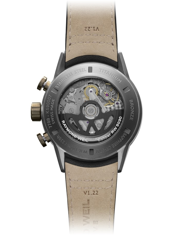 Корпус круглой формы выполнен из титанового сплава, прочного, легкого и гипоаллергенного металла, поверхности с матовой шлифовкой. Заводная коронка и кнопки хронографа из бронзы. Диаметр корпуса модели составляет 43,5 мм, толщина – 13.7 мм. Бронзовый безель с накладкой из керамики с гравированной разметкой тахиметрической шкалы. Задняя крышка с прозрачным окном из сапфирового стекла имеет резьбовое соединение с корпусом. Завинчивающаяся заводная коронка с монограммой RW. Водостойкость на глубине до 100 метров (10 бар/АТМ)