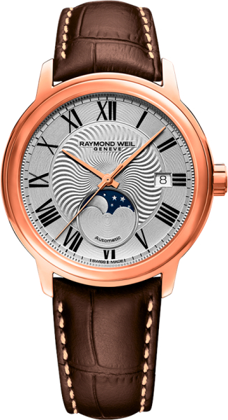 Центральная часть циферблата этой модели Raymond Weil Maestro Moon Phase серебристого цвета украшена гильошированием с волнообразным мотивом «лучи солнца», гильоширование в виде концентрических кругов на внешней стороне циферблата и на поверхности индикатора фаз Луны, печать римских цифр с черным или серебристым покрытием. Стрелки покрытием цвета родия или синей эмалью.
