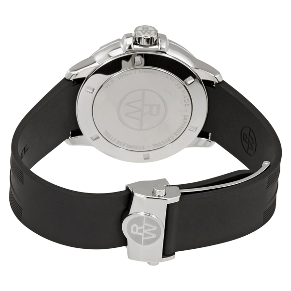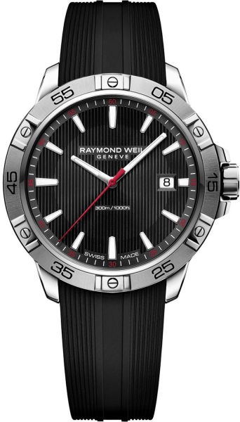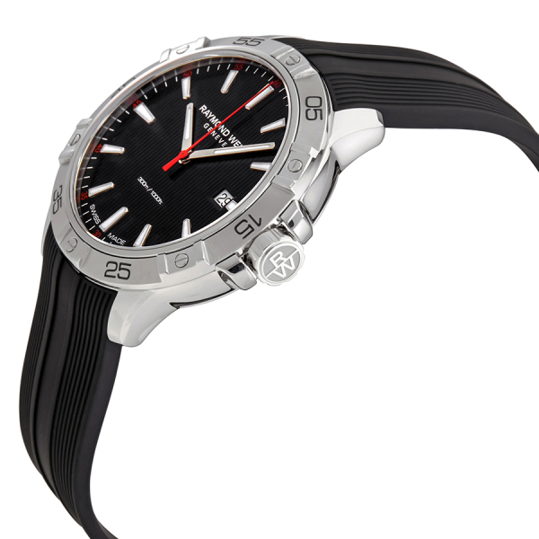Модель 8160-SR2-20001 на ремешке черного цвета из натурального каучука с тиснением. Браслетная застежка “бабочка”, раскладывающаяся при нажатии на кнопки с двойной системой блокировки, украшена логотипом Raymond Weil.