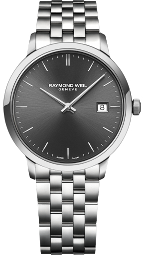 Модель 5485-ST-60001 на браслете из высококачественной стали с 5 рядами литых звеньев. Браслетная застежка, раскладывающаяся при нажатии на кнопки с двойной системой блокировки, украшена гравировкой Raymond Weil.