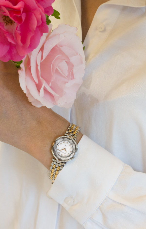 Циферблат из белого перламутра, драгоценные камни в качестве часовых меток, граненые стрелки “меч” с покрытием родием.