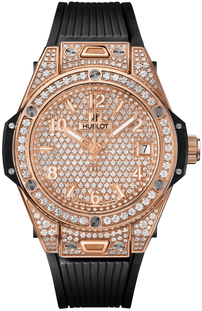 Корпус небольшого диаметра модели Hublot Big Bang One Click 465.OX.9010.RX.1604 выполнен из золота King Gold, поверхности с матовой шлифовкой – сатинированием и полировкой до зеркального блеска. Эксклюзивный золотой сплав King Gold имеет новый оттенок, еще более теплый, чем цвет традиционного красного золота 18 карат 5N. Золото King Gold содержит платину и превосходно поддается полировке и сатинированию. Диаметр корпуса составляет 39.00 мм. Корпус инкрустированный 118 бриллиантами общим весом около 0,84 карата. Безель, украшенный 42 бриллиантами общим весом 1.0 карата, соединяется с корпусом 6 титановыми винтами с фирменным H-образными шлицами. Задняя крышка с прозрачным окном из сапфирового стекла соединена с корпусом 6 винтами. Водостойкость 100 метров или 10 АТМ.