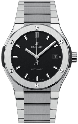 Модель Hublot Classic Fusion 510.NX.1170.NX имеет браслет с литыми звеньями из высокотехнологичного титана, поверхность звеньев с различными видами шлифовки. Браслетная застежка, раскладывающаяся при нажатии на кнопки двойной блокировки, украшена гравированным логотипом марки.