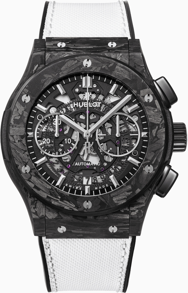 Модель Hublot Classic Fusion Aerofusion Frosted Carbon 525.QK.0170.NR.JPN имеет комбинированный ремешок из белого текстиля с подкладкой черного цвета из натурального каучука. Браслетная застежка из нержавеющей стали с черным покрытием, раскладывающаяся при нажатии на кнопки двойной блокировки, украшена гравированным логотипом марки.