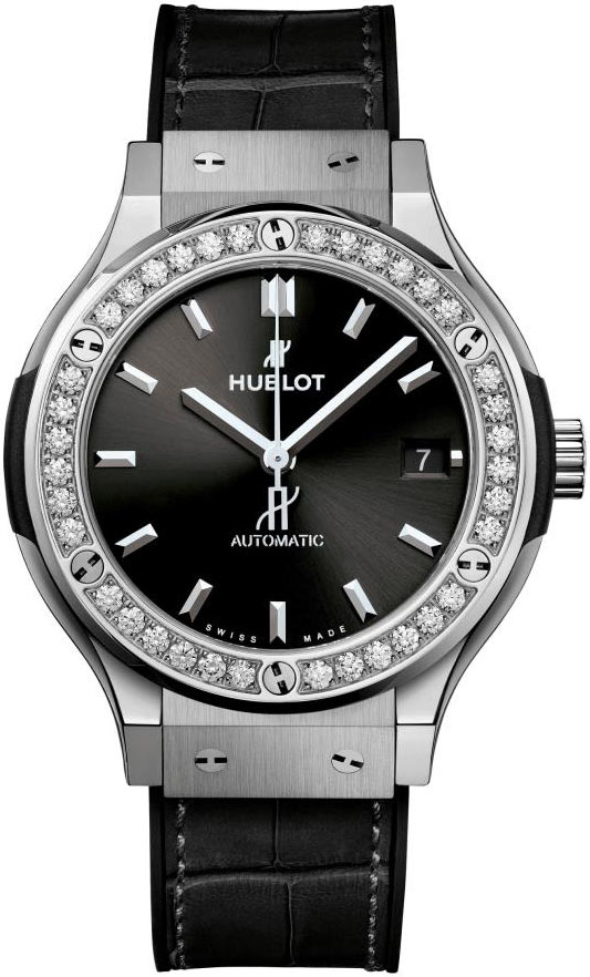Корпус модели Hublot Classic Fusion 565.NX.1470.LR.1204 выполнен из титана высшего качества Grade 5, поверхности с матовой шлифовкой – сатинированием и полировкой до зеркального блеска. Титан является исключительно легким и прочным, имеет высокую устойчивость к коррозии и гипоаллергенен, широко применяется в авиационной промышленности. Благодаря полировке данный материал приобретает слегка голубоватый металлический отблеск. Диаметр корпуса составляет 38.00 мм. Безель украшенный 36 бриллиантами общим весом 1,2 карата соединяется с корпусом 6 титановыми винтами с фирменным H-образными шлицами. Задняя крышка с прозрачным окном из сапфирового стекла соединен с корпусом 6 винтами. Водостойкость 50 метров или 5 АТМ.