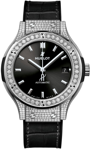 Корпус модели Hublot Classic Fusion 565.NX.1470.LR.1604 выполнен из титана высшего качества Grade 5, поверхности с матовой шлифовкой – сатинированием и полировкой до зеркального блеска. Титан является исключительно легким и прочным, имеет высокую устойчивость к коррозии и гипоаллергенен, широко применяется в авиационной промышленности. Благодаря полировке данный материал приобретает слегка голубоватый металлический отблеск. Диаметр корпуса составляет 38.00 мм. Корпус инкрустированный 218 бриллиантами общим весом около 0,8 карата. Безель, украшенный 36 бриллиантами общим весом 1,2 карата, соединяется с корпусом 6 титановыми винтами с фирменным H-образными шлицами. Задняя крышка с прозрачным окном из сапфирового стекла соединена с корпусом 6 винтами. Водостойкость 50 метров или 5 АТМ.