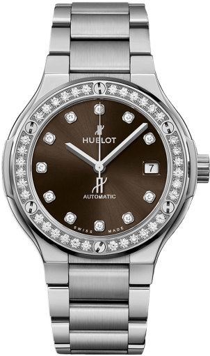 Корпус модели Hublot Classic Fusion 568.NX.897M.NX.1204 выполнен из титана высшего качества Grade 5, поверхности с матовой шлифовкой – сатинированием и полировкой до зеркального блеска. Титан является исключительно легким и прочным, имеет высокую устойчивость к коррозии и гипоаллергенен, широко применяется в авиационной промышленности. Благодаря полировке данный материал приобретает слегка голубоватый металлический отблеск. Диаметр корпуса составляет 38.00 мм. Безель, украшенный 36 бриллиантами общим весом 1,2 карата, соединяется с корпусом 6 титановыми винтами с фирменным H-образными шлицами. Задняя крышка с прозрачным окном из сапфирового стекла соединена с корпусом 6 винтами. Водостойкость 50 метров или 5 АТМ.