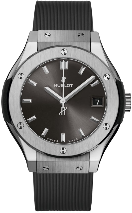 Модель Hublot Classic Fusion 581.NX.7071.RX имеет ремешок серого цвета из натурального каучука с тиснением в виде продольных линий. Браслетная застежка из нержавеющей стали, раскладывающаяся при нажатии на кнопки двойной блокировки, украшена гравированным логотипом марки.
