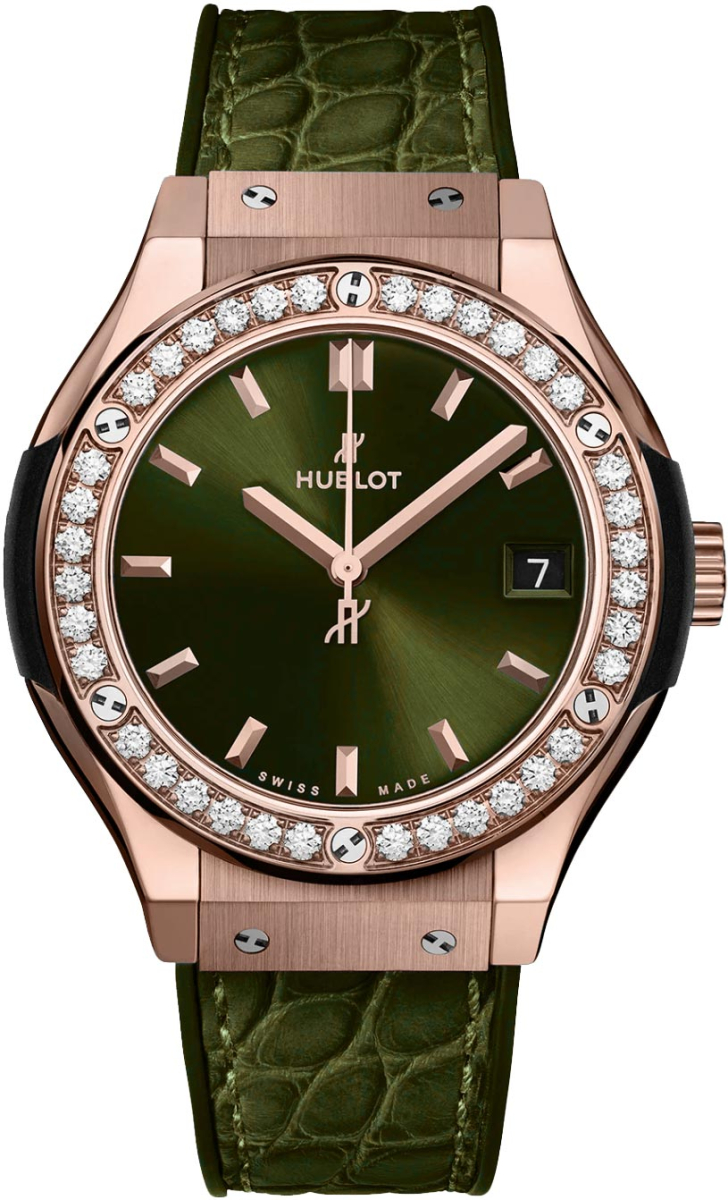 Модель Hublot Classic Fusion 581.OX.8980.LR.1104 имеет ремешок зеленого цвета из кожи аллигатора с подкладкой из натурального каучука. Браслетная застежка из золота King Gold 18K и нержавеющей стали с черным PVD-покрытием, раскладывающаяся при нажатии на кнопки двойной блокировки, украшена гравированным логотипом марки.