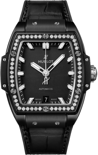 Корпус “бочка” модели Hublot Spirit of Big Bang 665.CX.1170.LR.1204 выполнен из черной высокотехнологичной керамики, поверхности с матовой шлифовкой – сатинированием и полировкой до зеркального блеска. Керамика выигрышно подчеркивает дизайн часов и надежно защищает механизм, превосходно выдерживая испытание временем. Керамика это сверхпрочный материал на основе циркония, который можно поцарапать только алмазом. Ширина корпуса составляет 39.00 мм. Безель украшенный 50 бриллиантами общим весом 1.0 карат соединяется с корпусом 6 титановыми винтами с фирменным H-образными шлицами. Задняя крышка с прозрачным окном из сапфирового стекла соединена с корпусом 6 винтами. Водостойкость 100 метров или 10 АТМ.