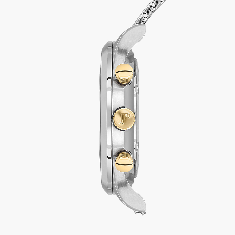 Корпус круглой формы выполнен из нержавеющей стали марки 316L с полировкой и матовой шлифовкой поверхностей. Переводная коронка и кнопки хронографа с IP покрытием цвета золота. Диаметр корпуса модели Jacques Philippe JPQGC031236 составляет 43 мм, толщина - 11.1 мм. Задняя крышка с гравировкой имеет резьбовое соединение с корпусом. Водостойкость 5 АТМ (50 метров).