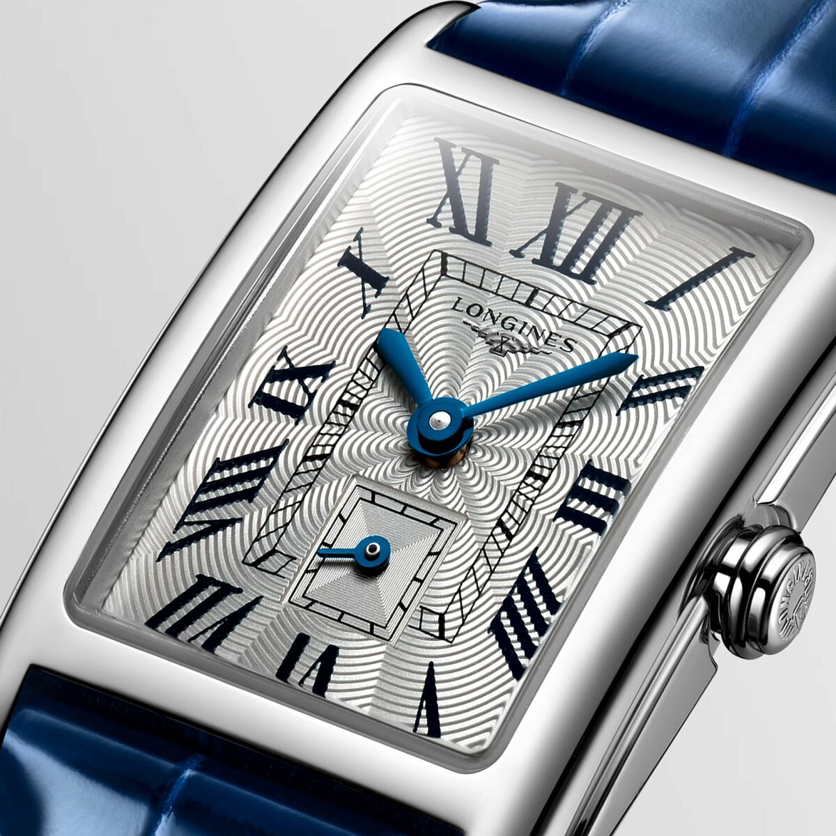 Модель Longines DolceVita L5.255.4.71.7 поставляется с темно-синим ремешком из кожи аллигатора, ширина 15 мм, пружинная система для быстрой замены ремешка/браслета, классическая застежка пряжка из нержавеющей стали.
