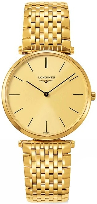 Модель Longines La Grande Classique L4.755.2.32.8 поставляется с браслетом из нержавеющей стали с литыми звеньями в 9 рядов, PVD-покрытие цвета золота, ширина 20 мм, браслетная застежка тройного сложения “бабочка” раскладывается при нажатии кнопок двойной фиксации.