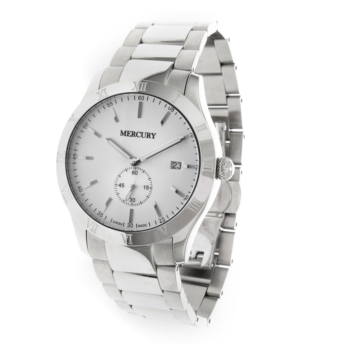 Циферблат модели Mercury MEM469-SS-1 серебристо-белого цвета, дополнительный индикатор со стилизацией под гильоширование в виде концентрических кругов. аппликация часовых индексов и стрелки с серебристым покрытием.