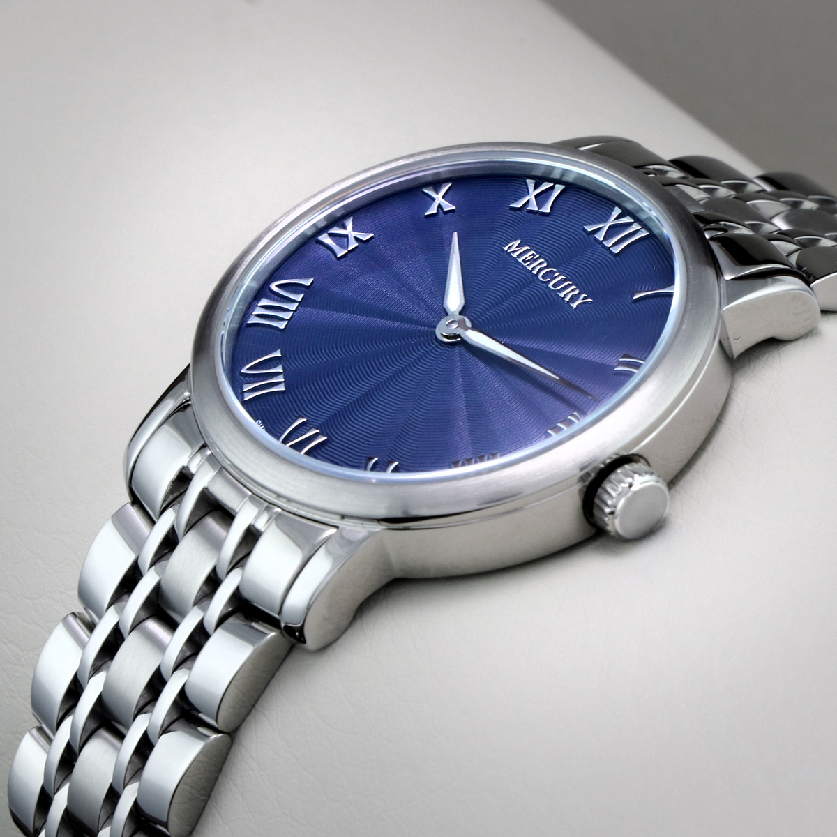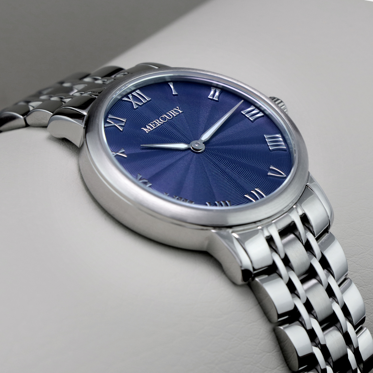 Циферблат модели Mercury ME400-SS-9 глубокого синего цвета со стилизацией под гильоширование в стиле “капли воды”. Печать стилизованных римских цифр и стрелки с серебристым покрытием.