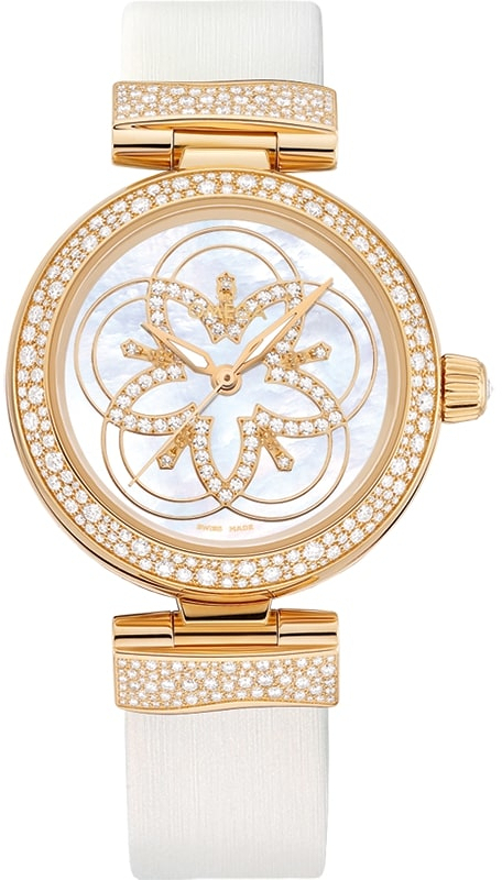 Выразительный циферблат из 18-каратного розового золота с перламутровым наборным узором и выложенным из бриллиантов «Top Wesselton» VVS цветком в форме пяти переплетающихся логотипов марки, полированные стрелки "альфа" из золота 18К.