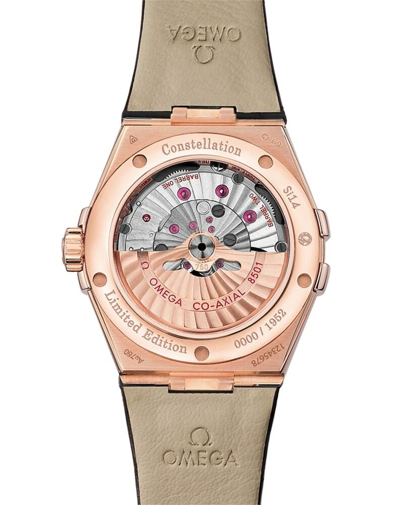 Швейцарский мануфактурный механизм, калибр Omega Chronometer 8501, с спуском Co-Axial, запатентованным Omega. Коаксиальный спуск был разработан, чтобы уменьшить трение деталей часового механизма, ему требуется меньше смазки, и как следствие реже сервисное обслуживание. Точность хода механизмов Master Chronometer проходит тщательную проверку. Механизм получает сертификат хронометра в Швейцарском институте тестирования хронометров COSC (допустимая погрешность точности хода составляет от -4 до +6 секунд в сутки). Запас хода составляет 60 часов благодаря двум, последовательно установленным, заводным барабанам. Мосты и платина механизма имеют родиевое покрытие и декорированы узором Cotes de Geneve (Женевские волны), балансовый мост и ротор автоподзавода из розового золота. Функции: часовая, минутная и секундная стрелки, индикация даты, быстрый перевод часовой стрелки при смене часового пояса.