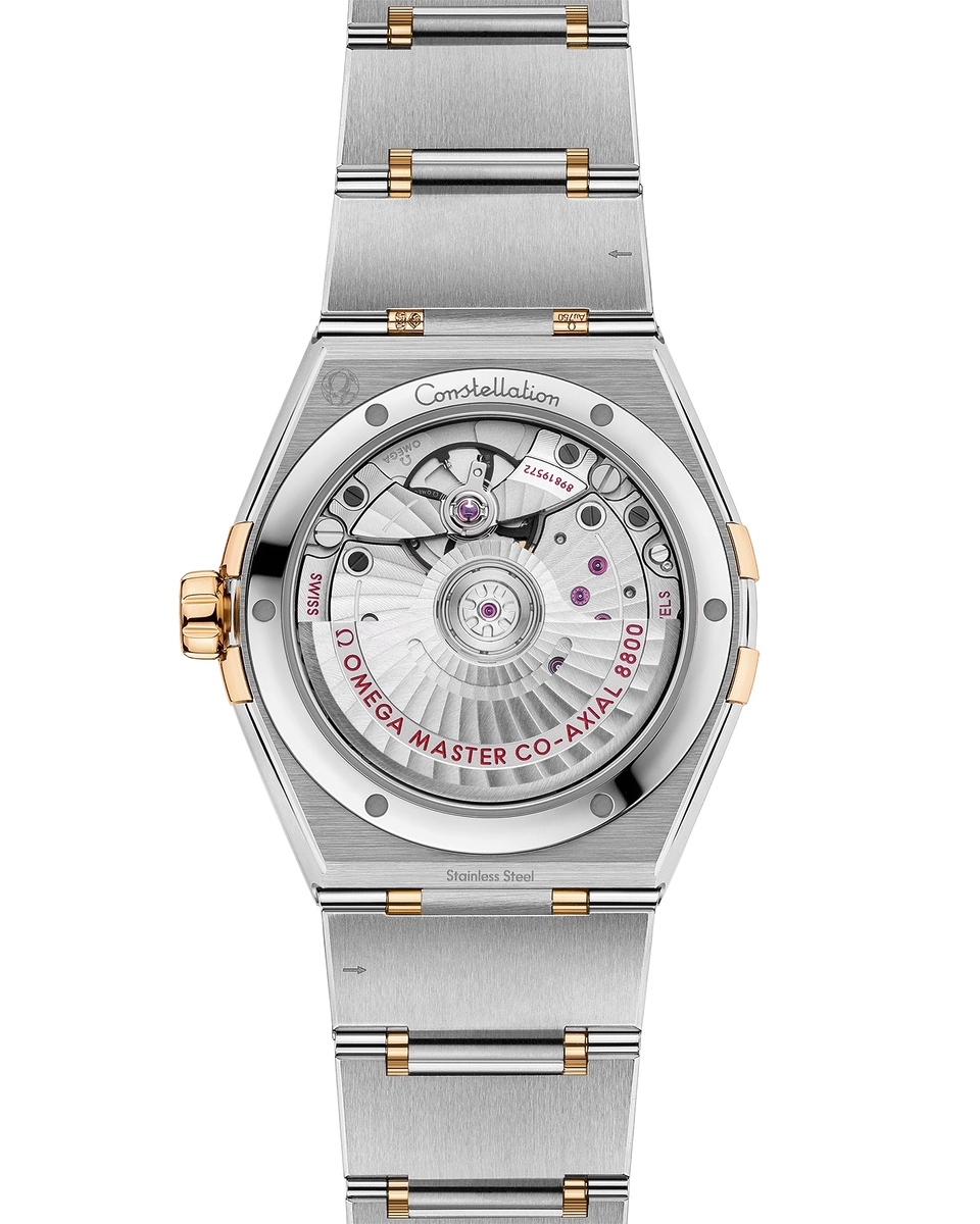 Швейцарский мануфактурный механизм, калибр Omega Master Chronometer 8800, с спуском Co-Axial, запатентованным Omega. Коаксиальный спуск был разработан, чтобы уменьшить трение деталей часового механизма, ему требуется меньше смазки, и как следствие реже сервисное обслуживание. Точность хода механизмов Master Chronometer проходит двойную проверку. Сначала механизм получает сертификат хронометра в Швейцарском институте тестирования хронометров COSC (допустимая погрешность точности хода составляет от -4 до +6 секунд в сутки). Затем часы и механизм проходят 8 тестов Швейцарского федерального института метрологии METAS, где допустимая средняя суточная погрешность хода составляет от 0 до +5 секунд. Специально разработанные антимагнитные материалы, например пружина баланса из кремния, позволяют избежать воздействие магнитных полей от мобильных телефонов, индукционных плит, МРТ и т.д. силой до 15 000 гаусс. Запас хода составляет 55 часов. Мосты и платина механизма, ротор автоподзавода имеют родиевое покрытие и декорированы узором Cotes de Geneve (Женевские волны). Функции: часовая, минутная и секундная стрелки, индикация даты.