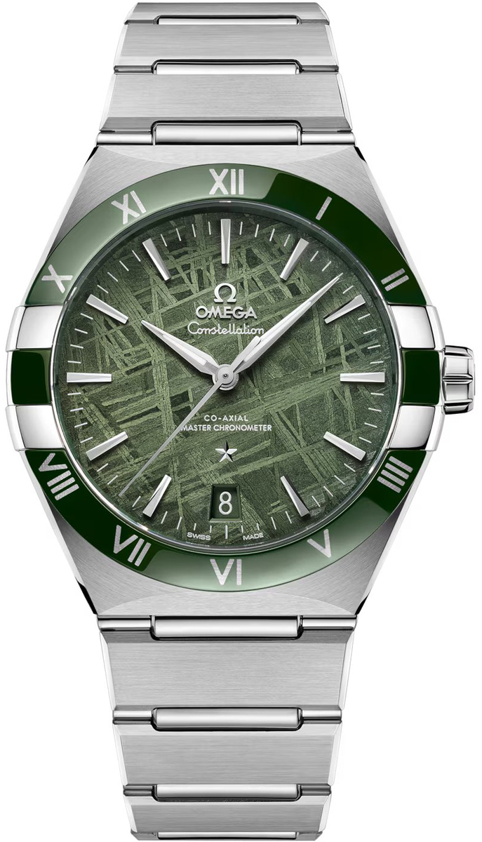 Круглый корпус модели Omega Constellation 131.30.41.21.99.002 выполнен из нержавеющей стали, диаметр 41 мм, высота 13.5 мм. Безель из темно-зеленой керамики с римскими цифрами из материала Liquidmetal. Завинчивающаяся задняя крышка с прозрачным окном из сапфирового стекла. Водонепроницаемость 5 бар (50 метров / 167 футов).