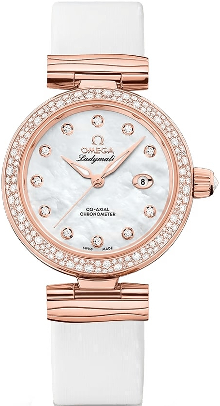 Модель 425.67.34.20.55.008 поставляется на белом ремешке из телячьей кожи с сатинированием и зернением. Браслетная застежка из золота Sedna с гравированной эмблемой Omega.