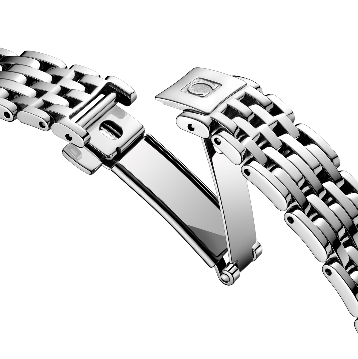 Модель 424.10.33.20.01.001 поставляется на браслете с 7 рядами литых звеньев из нержавеющей стали, поверхности с различными видами финишной обработки, ширина 16 мм. Браслетная застежка с гравированной эмблемой Omega.