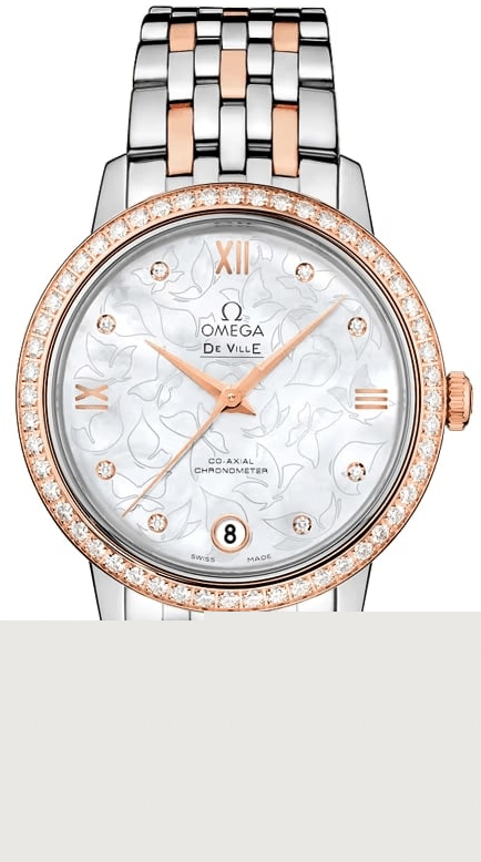 Швейцарские часы Omega De Ville Prestige «Butterfly» 424.25.33.20.55.003 созданы для успешных женщин, предпочитающих классический элегантный дизайн. Модели Omega De Ville Prestige отличаются чистотой линий, роскошной отделкой и всегда актуальным дизайном. Циферблат из натурального перламутра с уникальным полированным узором «Butterfly» в виде бабочек, которых нанесены переводным способом. Внутри корпуса универсального размера из стали и розового золота, украшенного бриллиантами, работает коаксиальный часовой механизм Omega 2500 точность хода которого подтверждена сертификатом хронометра.