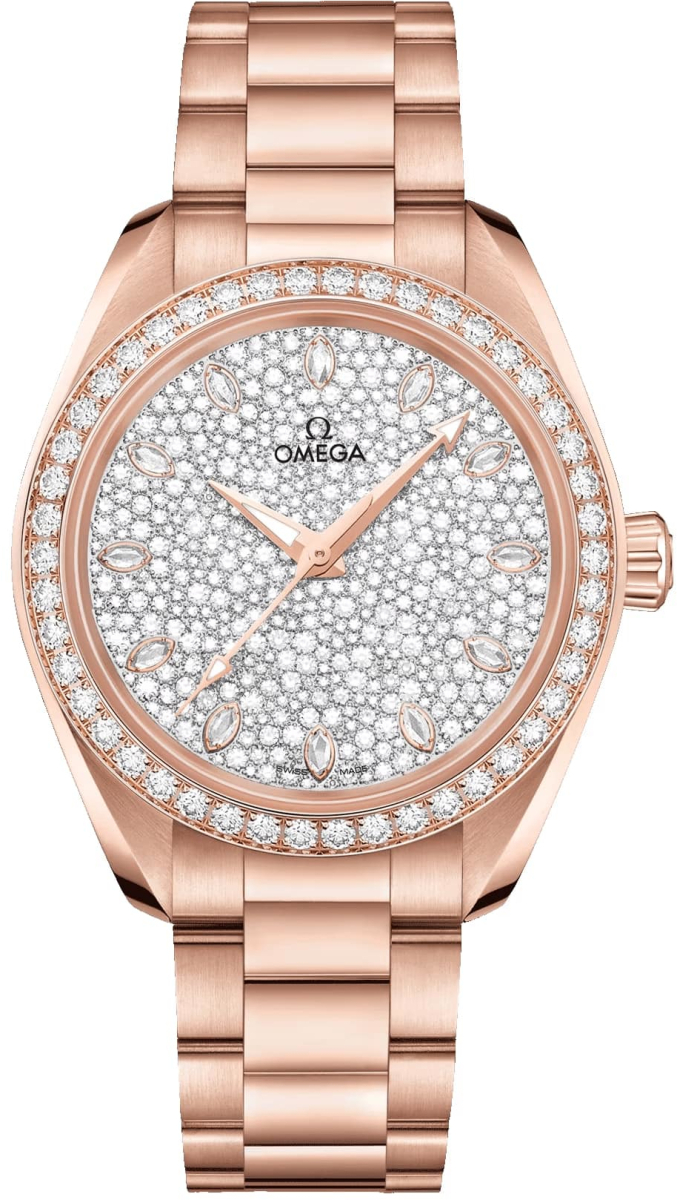 Швейцарские часы Omega Seamaster Aqua Terra 150M 220.55.34.20.99.003 созданы для успешных современных женщин, предпочитающих динамичный стиль и не чуждых роскоши. Великолепные модели Seamaster Aqua Terra воздают должное богатому морскому наследию часовой марки Omega. Эргономичный корпус выполнен из золота Sedna и имеет небольшой размер. Золото Sedna, названное в честь малой планеты Седны, которая признается самым красным космическим телом Солнечной системы. Уникальный состав этого золотого сплава включает в себя медь и палладий, что позволяет получить уникальный цвет, обеспечить прочность изделий и высокую устойчивость к выцветанию и потускнению. Заднюю крышку отличает характерный дизайн с фирменным волнообразным шлицем. Циферблат украшенный множеством бриллиантов делает часы центральной деталью любого имиджа. Мануфактурный механизм соответствует высочайшим стандартам часовой индустрии и обладает хронометрической точностью благодаря фирменному спуску Co-Axial.