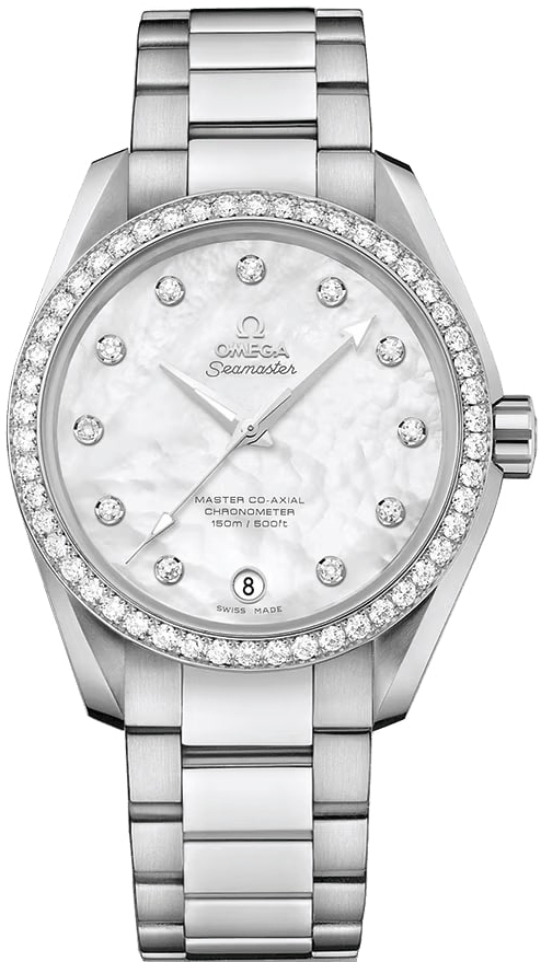 Швейцарские часы Omega Seamaster Aqua Terra 150M 231.15.39.21.55.001 созданы для успешных современных женщин, предпочитающих динамичный стиль и не чуждых роскоши. Великолепные модели Seamaster Aqua Terra воздают должное богатому морскому наследию часовой марки Omega. Эргономичный корпус выполнен из высококачественной стали и имеет универсальный размер. Циферблат из перламутра и безель, украшенный бриллиантами, делают часы центральной деталью любого имиджа. Мануфактурный механизм соответствует высочайшим стандартам часовой индустрии и обладает хронометрической точностью благодаря фирменному спуску Co-Axial.