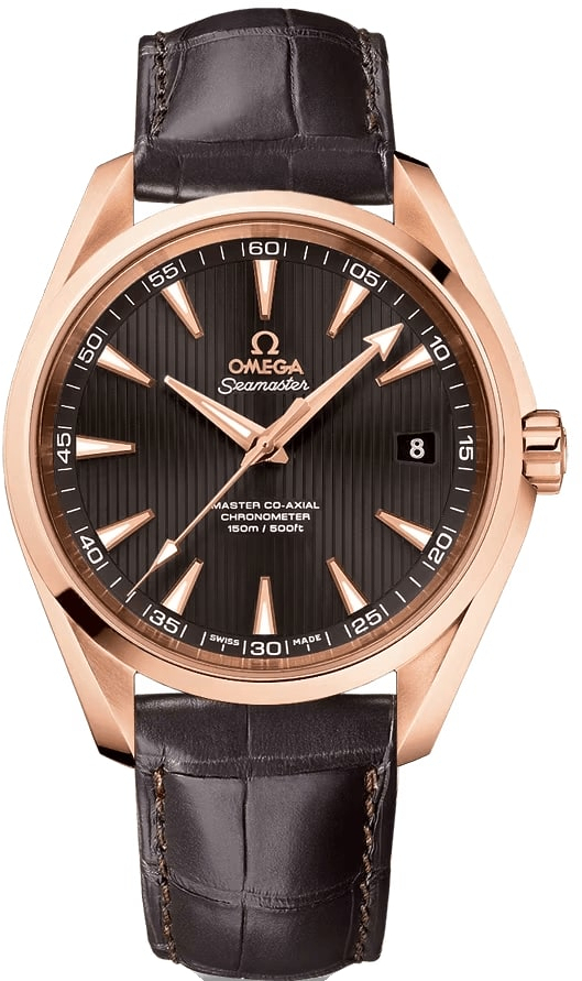 Круглый корпус модели Omega Seamaster Aqua Terra 150M 231.53.42.21.06.002 выполнен из красного золота 18К, диаметр 41,5 мм, высота 13.0 мм. Заводная головка с винтовой фиксацией. Завинчивающаяся задняя крышка с прозрачным окном из сапфирового стекла. Водонепроницаемость 15 бар (150 метров / 500 футов).
