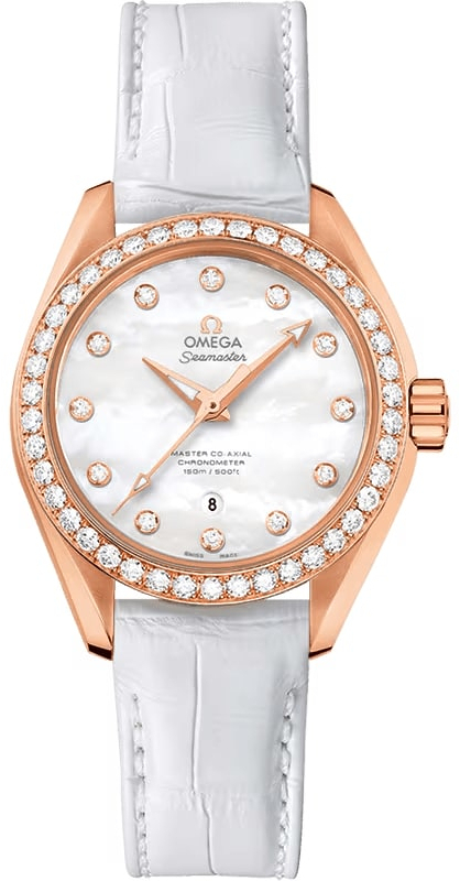 Швейцарские часы Omega Seamaster Aqua Terra 150M 231.58.34.20.55.003 созданы для успешных современных женщин, предпочитающих динамичный стиль и не чуждых традиций. Великолепные модели Seamaster Aqua Terra воздают должное богатому морскому наследию часовой марки Omega. Эргономичный корпус выполнен из золота Sedna и имеет небольшой размер. Золото Sedna, названное в честь малой планеты Седны, которая признается самым красным космическим телом Солнечной системы. Уникальный состав этого золотого сплава включает в себя медь и палладий, что позволяет получить уникальный цвет, обеспечить прочность изделий и высокую устойчивость к выцветанию и потускнению. Заднюю крышку отличает характерный дизайн с фирменным волнообразным шлицем. Циферблат из перламутра с бриллиантами делает часы центральной деталью любого имиджа. Мануфактурный механизм соответствует высочайшим стандартам часовой индустрии и обладает хронометрической точностью благодаря фирменному спуску Co-Axial.