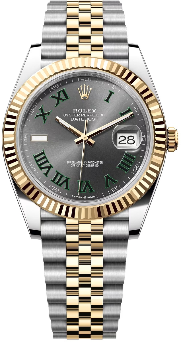 Циферблат с эффектом солнечного перелива, который достигается мастерами марки благодаря технике сатинирования. Бороздки, идущие радиально, равномерно распределяют свет создавая характерный мягкий блеск, меняющийся в зависимости от положения часов на запястье. Темно-серый цвет циферблату придается благодаря технике PVD. Завершает отделку циферблата легкая лакировка. Рисованные эмалью римские цифры черно-зеленой расцветки в стиле Wimbledon. Аппликация часовых индексов и эмблемы марки с драгоценным покрытием и полировкой. Люминесцентное вещество Chromalight с длительным свечением в темноте, запатентованное компанией Rolex, на часовых индексах и стрелках.