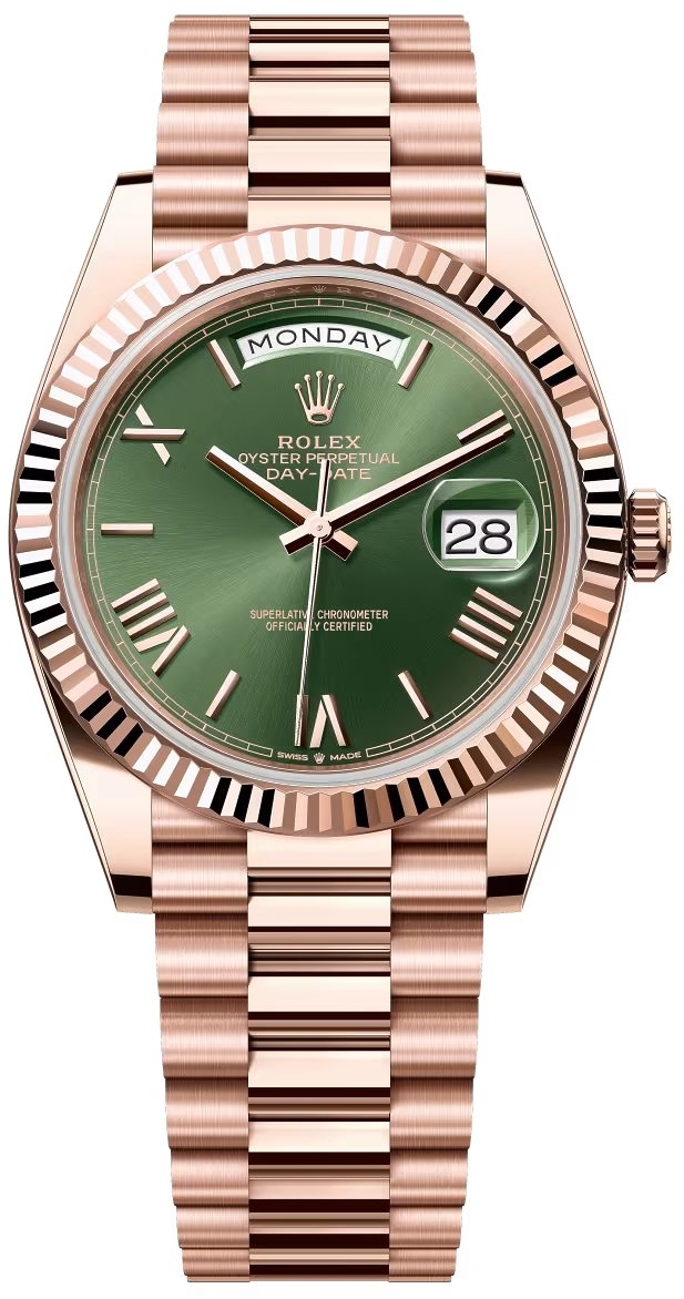 Модель 228235-0025 на браслете со звеньями в 3 ряда из золота Everose 18К. Браслет President, впервые был использован в 1956 году в модели Day‑Date. Он производится из 18‑каратного золота или платины 950 пробы и отличается идеальной симметрией, являясь эталоном классической красоты. Роскошный и удобный браслет President с полукруглыми массивными звеньями и различными видами финишной шлифовки. Скрытая застежка Crownclasp с раскладывающейся пряжкой.