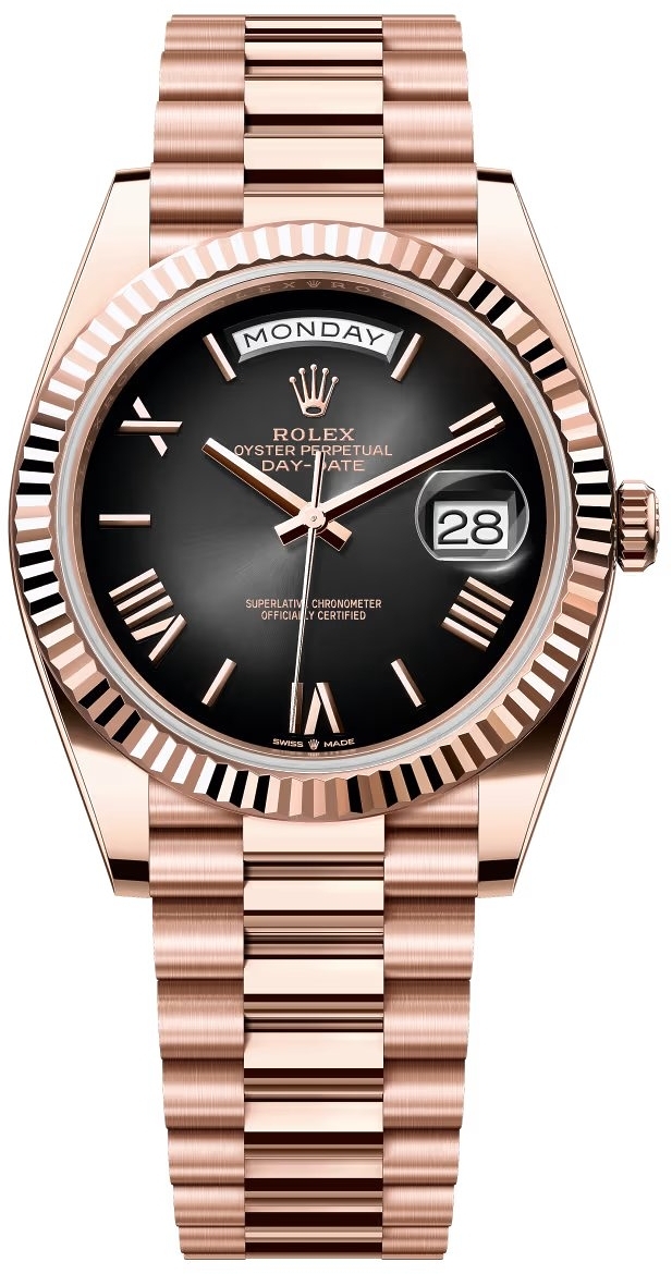 Модель 228235-0055 на браслете со звеньями в 3 ряда из золота Everose 18К. Браслет President, впервые был использован в 1956 году в модели Day‑Date. Он производится из 18‑каратного золота или платины 950 пробы и отличается идеальной симметрией, являясь эталоном классической красоты. Роскошный и удобный браслет President с полукруглыми массивными звеньями и различными видами финишной шлифовки. Скрытая застежка Crownclasp с раскладывающейся пряжкой.
