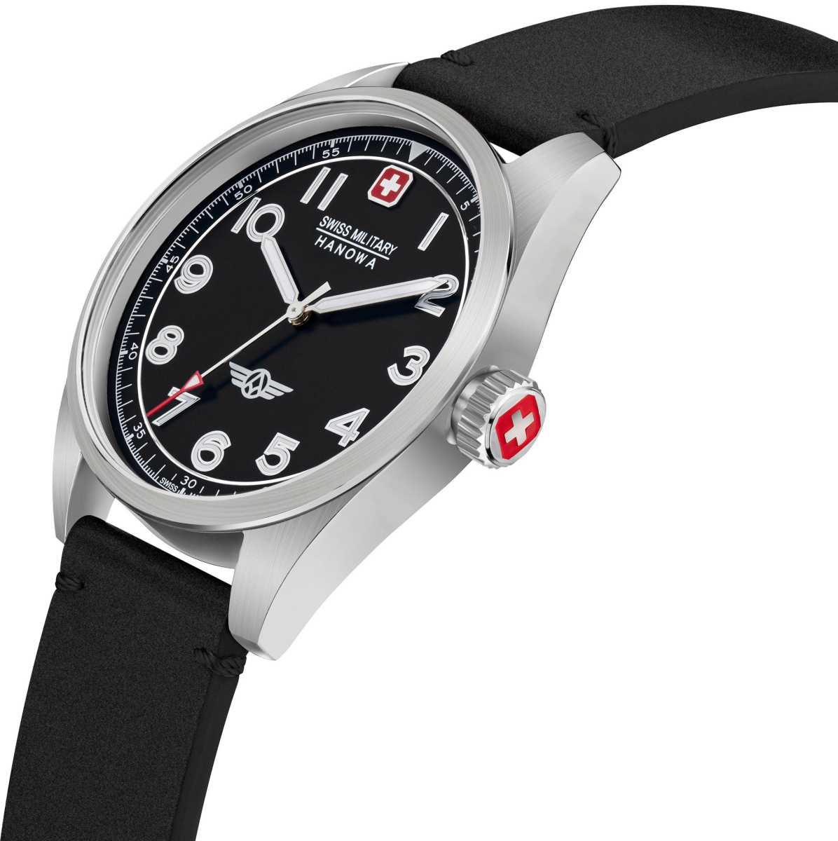 Циферблат “пилот” модели Hanowa Swiss Military SMWGA2100401 черного цвета в винтажном стиле. Аппликация эмблемы бренда, часовые метки и стрелки с серебристым покрытием.