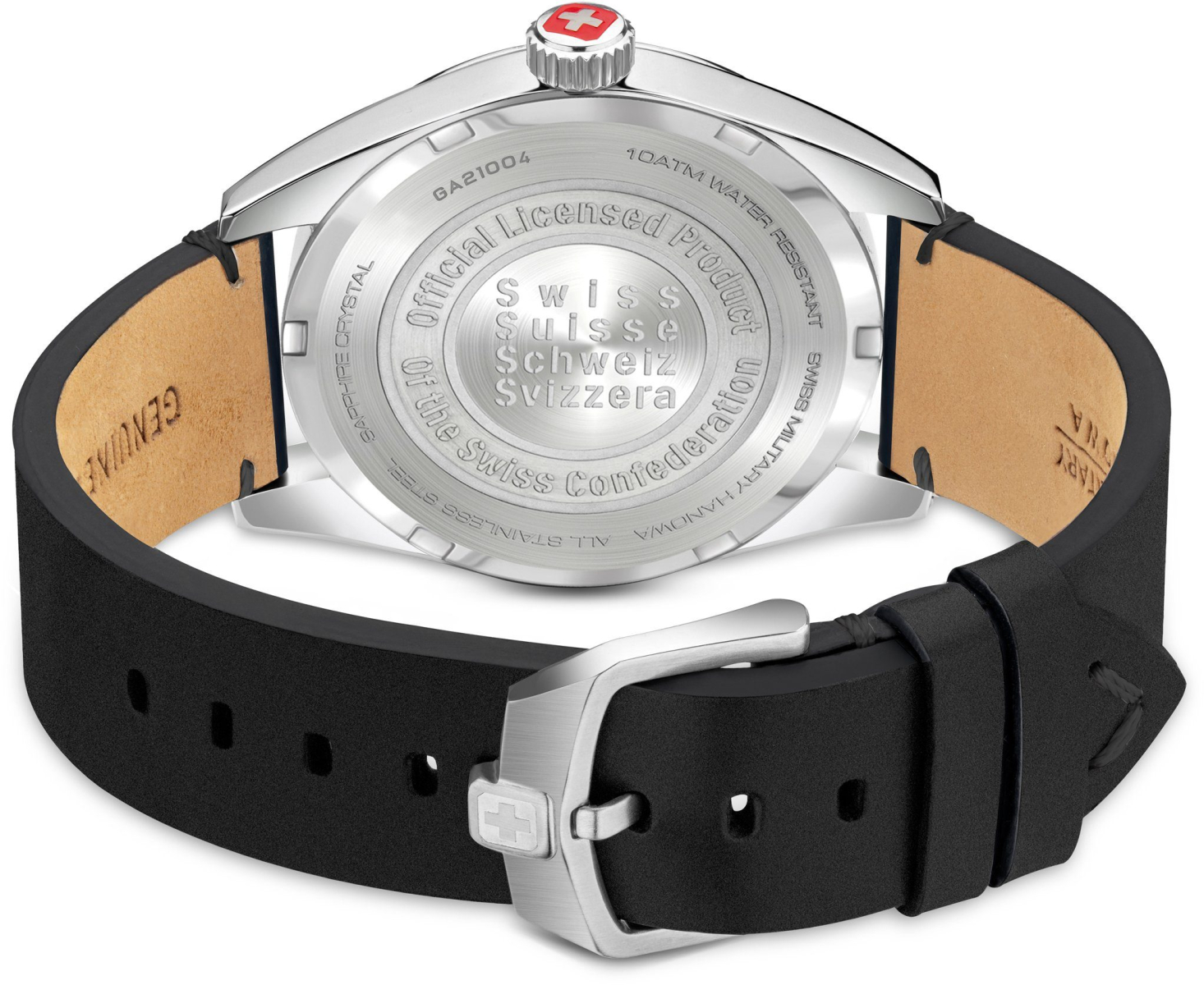 Корпус круглой формы выполнен из нержавеющей стали марки 316L с матовой шлифовкой и глянцевой полировкой поверхностей. Диаметр корпуса модели Hanowa Swiss Military SMWGA2100401 составляет 42 мм. Переводная коронка украшена гравированной эмблемой бренда с красным акцентом. Задняя крышка с гравировкой. Водостойкость 100 метров (10 АТМ).