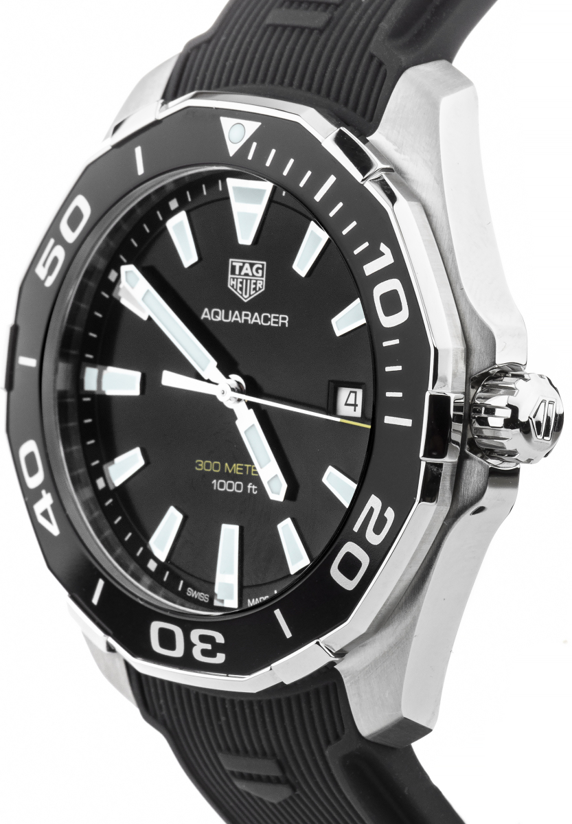 Круглый корпус Aquaracer WAY101A.FT6141 выполнен из нержавеющей стали 316L, поверхности с матовой шлифовкой - сатинированием и глянцевой полировкой. Диаметр корпуса составляет 43 мм. Поворотный безель с алюминиевой накладной на фронтальной поверхности черного цвета и контрастной разметкой вращается со щелчками против хода стрелок, капсула со светящимся в темноте светонакопительным элементом на 12 часах. Переводная коронка с винтовой фиксацией. Задняя крышка с гравировкой в стиле Aquaracer с изображением водолазного шлема - “колокола” имеет резьбовое соединение с корпусом. Водостойкость 300 метров (30 бар/АТМ).