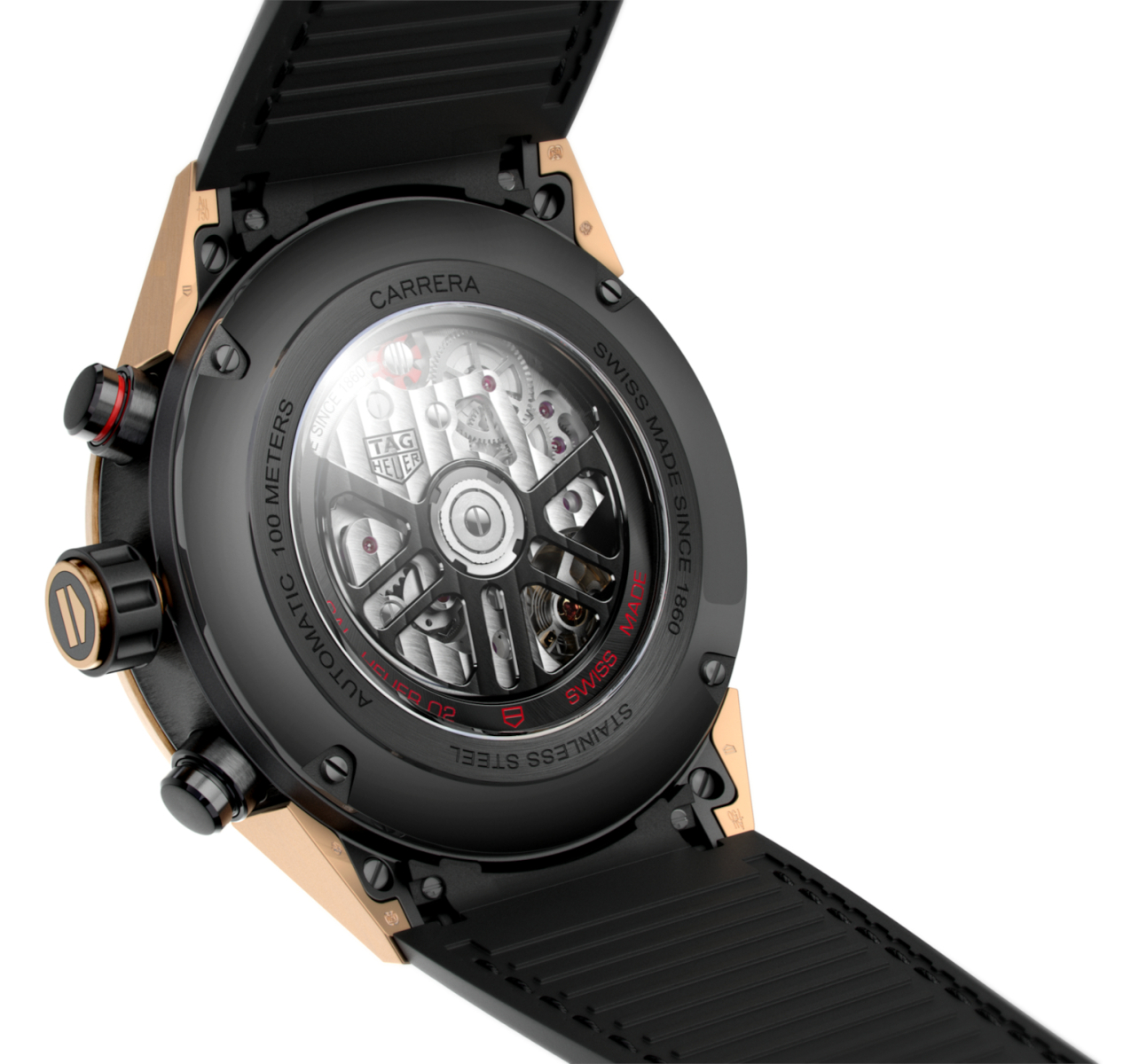 Корпус Carrera CBG2A51.FC6450 выполнен из нержавеющей стали 316L, поверхности с матовой шлифовкой - сатинированием. PVD покрытие черного цвета. Диаметр корпуса составляет 45 мм. Дужки крепления ремешка/браслета и переводная коронка из цельного розового золота 18К. Фиксированный безель из золота 5N с гравированной разметкой тахиметрической шкалы. Задняя крышка с прозрачным окном из сапфирового стекла соединена с корпусом 4 винтами. Водостойкость 100 метров (10 бар/АТМ).