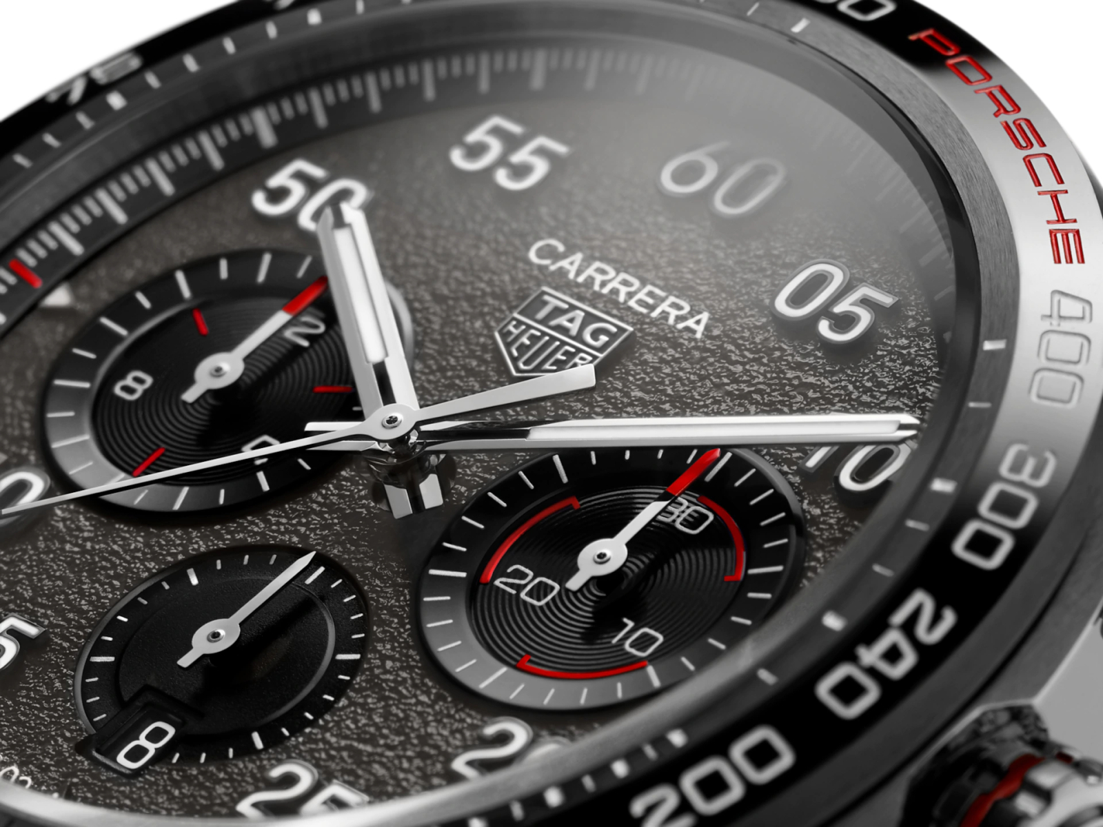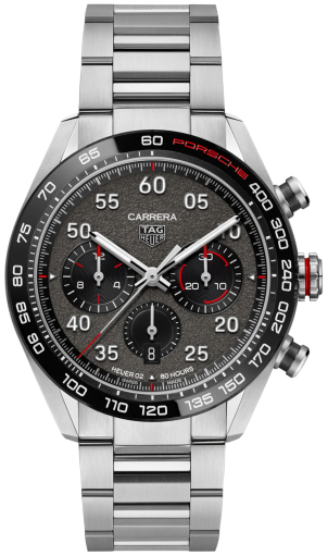 Циферблат серого цвета антрацита с зернистой обработкой, дополнительные индикаторы с гильошированием в виде концентрических кругов и черным покрытием. Аппликация эмблемы TAG Heuer, цифр разметки циферблата и стрелки с покрытием родием, ювелирной огранкой и финишной шлифовкой. Светящееся в темноте покрытие люминофором Superluminova стрелок и разметки циферблата.